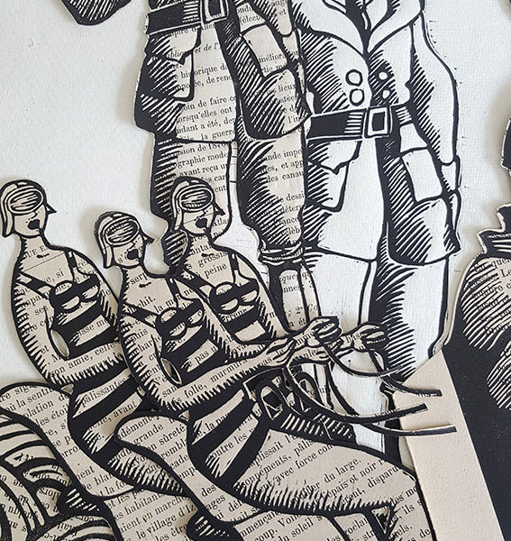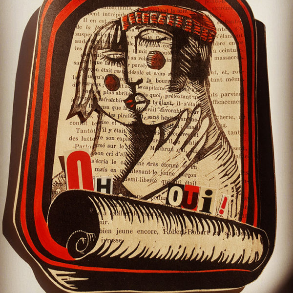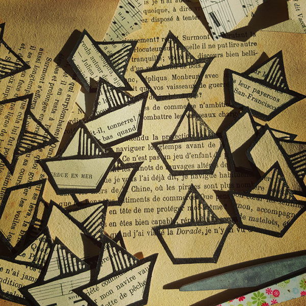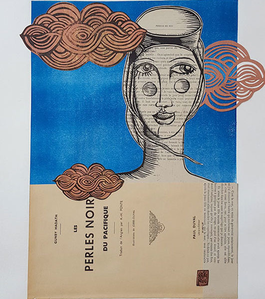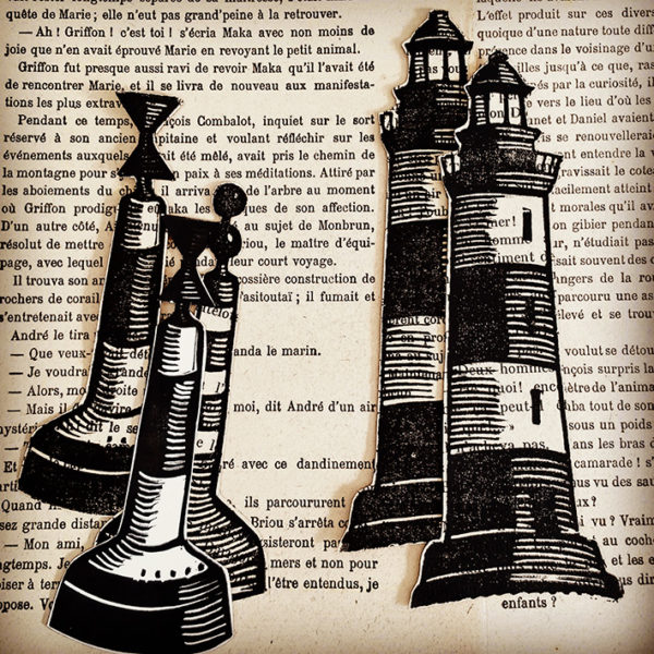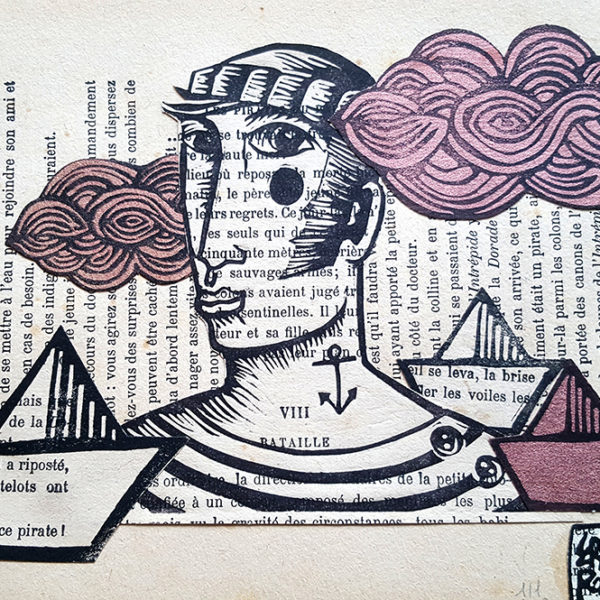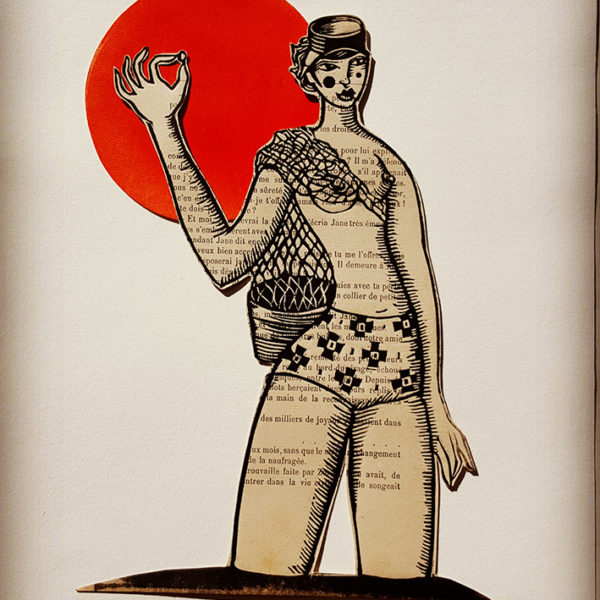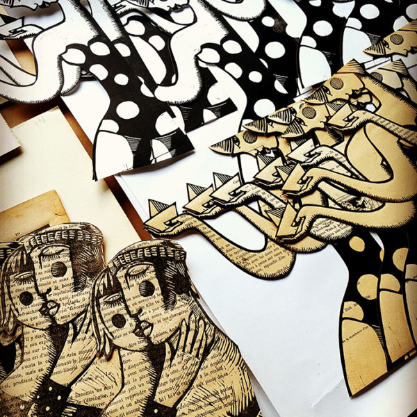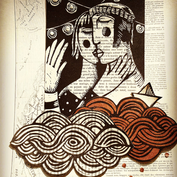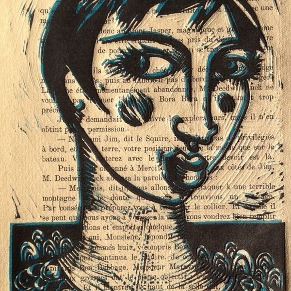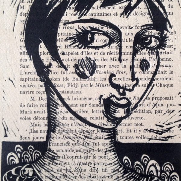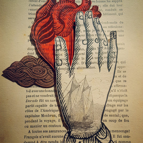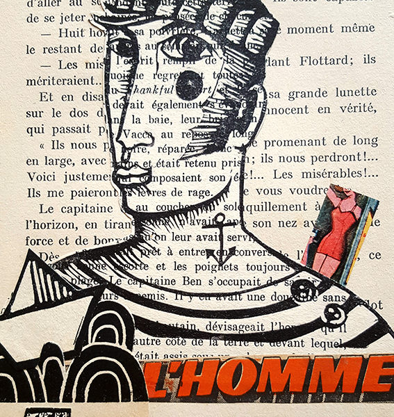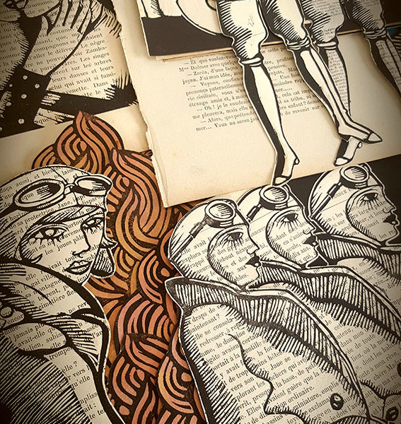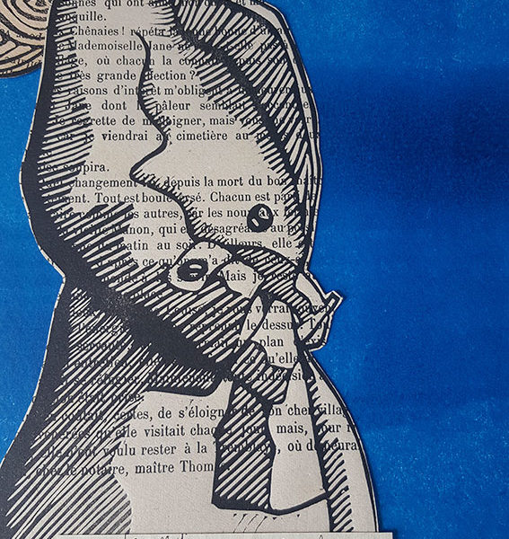 Une part importante de mon travail. J’aime beaucoup imprimer sur des pages de livres anciens aux feuilles jaunies. Cet apport littéraire insuffle ainsi vie et émotion aux personnages.