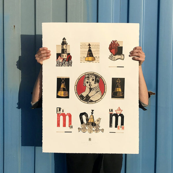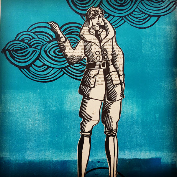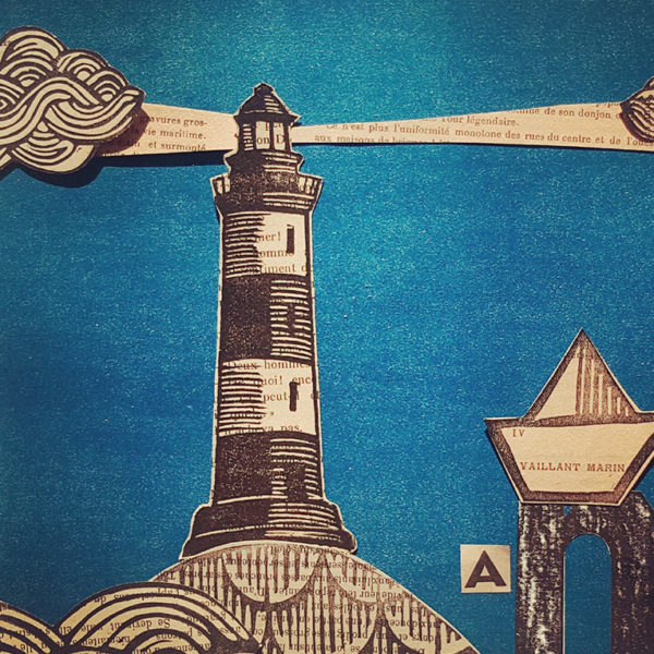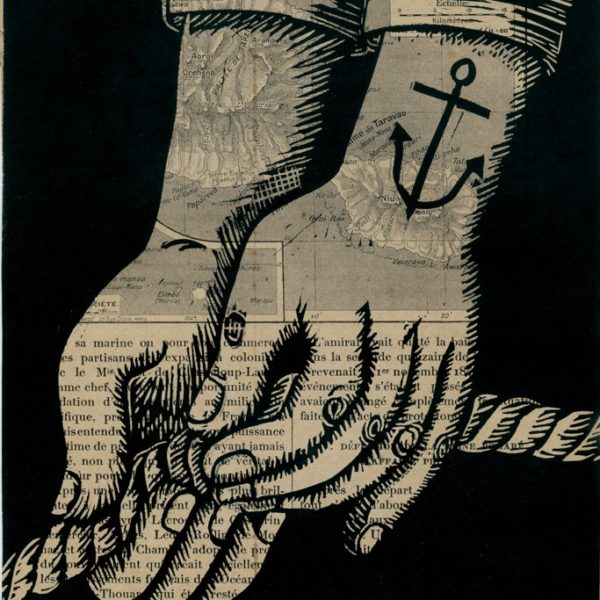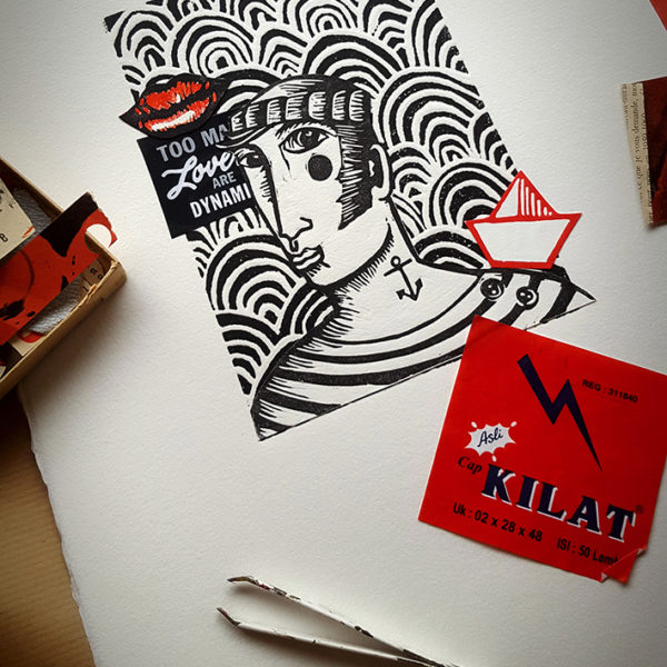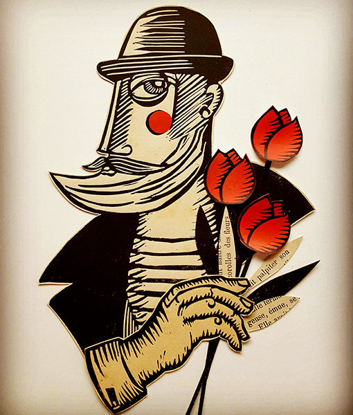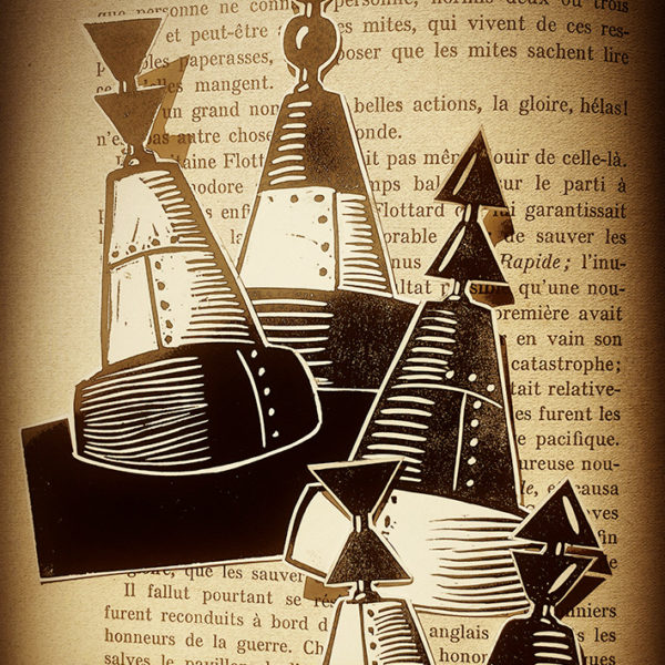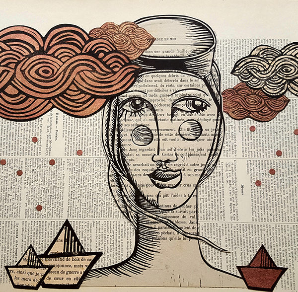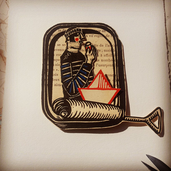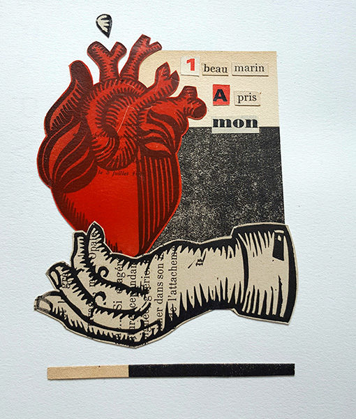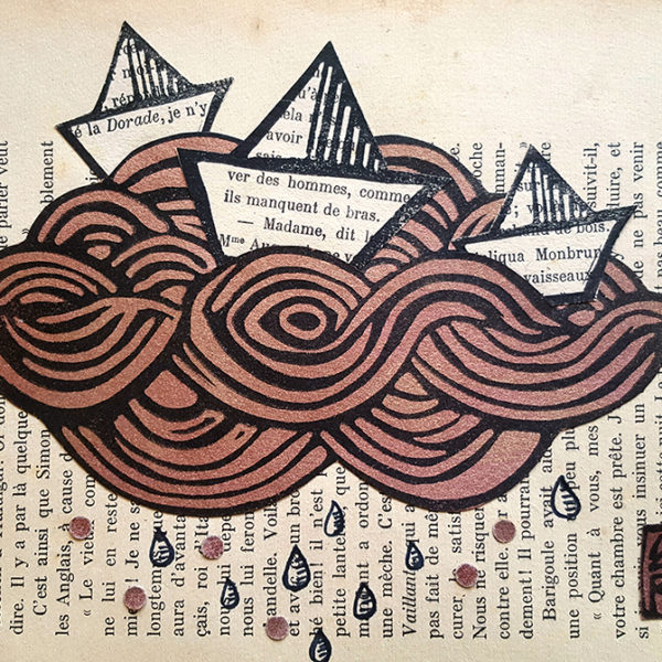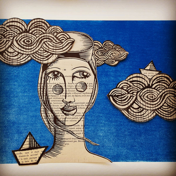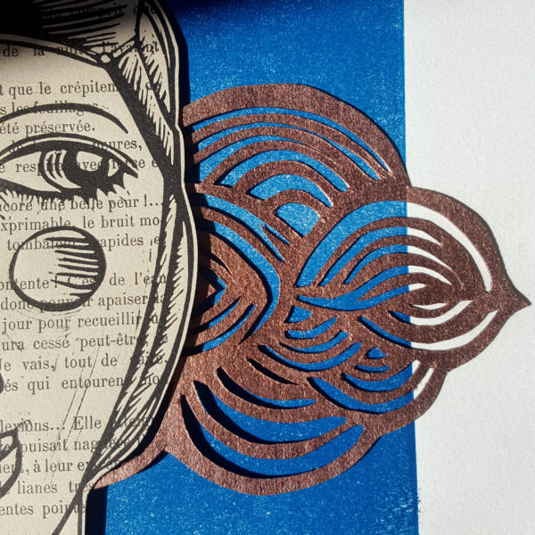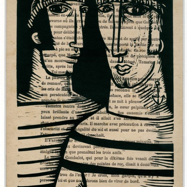 Une part importante de mon travail. J’aime beaucoup imprimer sur des pages de livres anciens aux feuilles jaunies. Cet apport littéraire insuffle ainsi vie et émotion aux personnages.